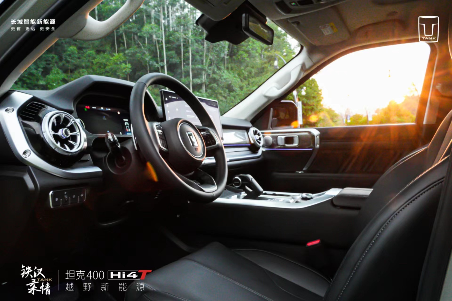 坦克400内饰舒阔豪华,车身尺寸4985/1960/1900mm,轴距达2850mm,采用Nappa打孔真皮座椅(高配),13处软性包覆,全系标配主驾电动4向腰部支撑和前排座椅加热,高配版还设有主驾电动6向座椅调节+8点按摩+记忆,驾乘体验宽敞静谧。无论是坦克400 Hi4-T配备的ANC主动降噪技术、10个高性能扬声器的高保真立体音响系统,亦或电动侧踏、电吸后尾门等精妙设计,均为用户营造出智与美的不二之选。12.3寸液晶仪表+16.2寸中央显示屏+HUD抬头显示配合流媒体后视镜,使驾驶者悦享540°全景影像的征服者视角,轻松掌控车辆导航等实时信息,感官氛围营造可谓锋芒毕现。