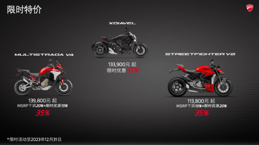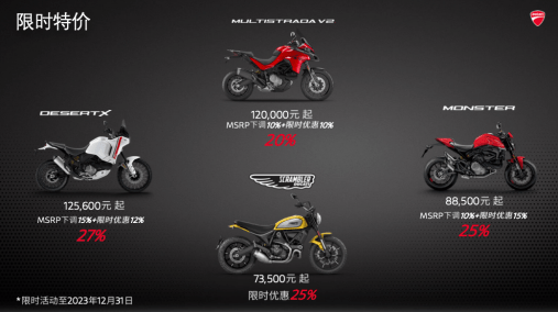此次发布的全系车型价格政策有效期至 2023 年 12 月 31 日。杜卡迪中国保留对本政策相关解释的权利。