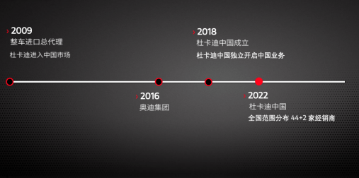 杜卡迪于 2009 年正式进入中国市场,在 2016 年加入奥迪中国后,又于 2018 年成立杜卡迪中国,正式独立开启中国业务,至今已在全国分布 44+2 家授权经销商门店。2016 年至 2022 年的 7 年间,杜卡迪在中国市场表现节节攀升,年销量增长 200%,取得了骄人业绩的同时,也拥有了众多忠实的杜卡迪车主与粉丝。