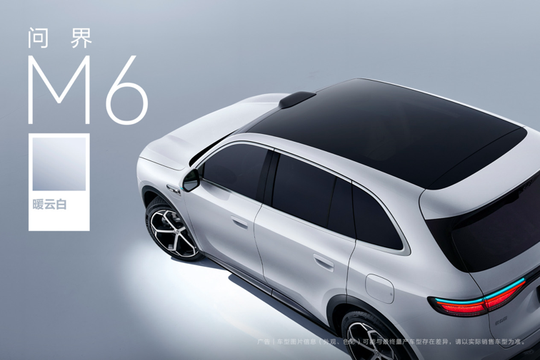 问界M6由华为设计力量全流程主导,遵循“极致、简约、纯净”美学原则,传承家族展翼设计并创新演绎,车身尺寸4960×1985×1736mm,轴距2950mm,兼顾SUV体量与轿跑动感。前脸俯冲姿态鲜明,晶曜大灯与尾灯单侧各含千颗晶钻折射体,AITO字样融入尾灯,辅助驾驶激活时前保险杠、后视镜、尾灯小蓝灯同步亮起。车身侧面光影丰富,提供星夜紫等七款外饰配色,采用五涂层油漆工艺,可选装黑曜运动套件,搭配20/21英寸共五种轮毂。 内饰为环抱式沉浸座舱,类机车造型中控呈对称布局,搭配D型方向盘与一体式运动座椅,提供紫慕白等四款内饰配色,17处可调节氛围灯搭配2.352m²全景天幕+直驱式电动遮阳帘;主副驾配备318×100mm超大化妆镜,支持三档色温与亮度调节。